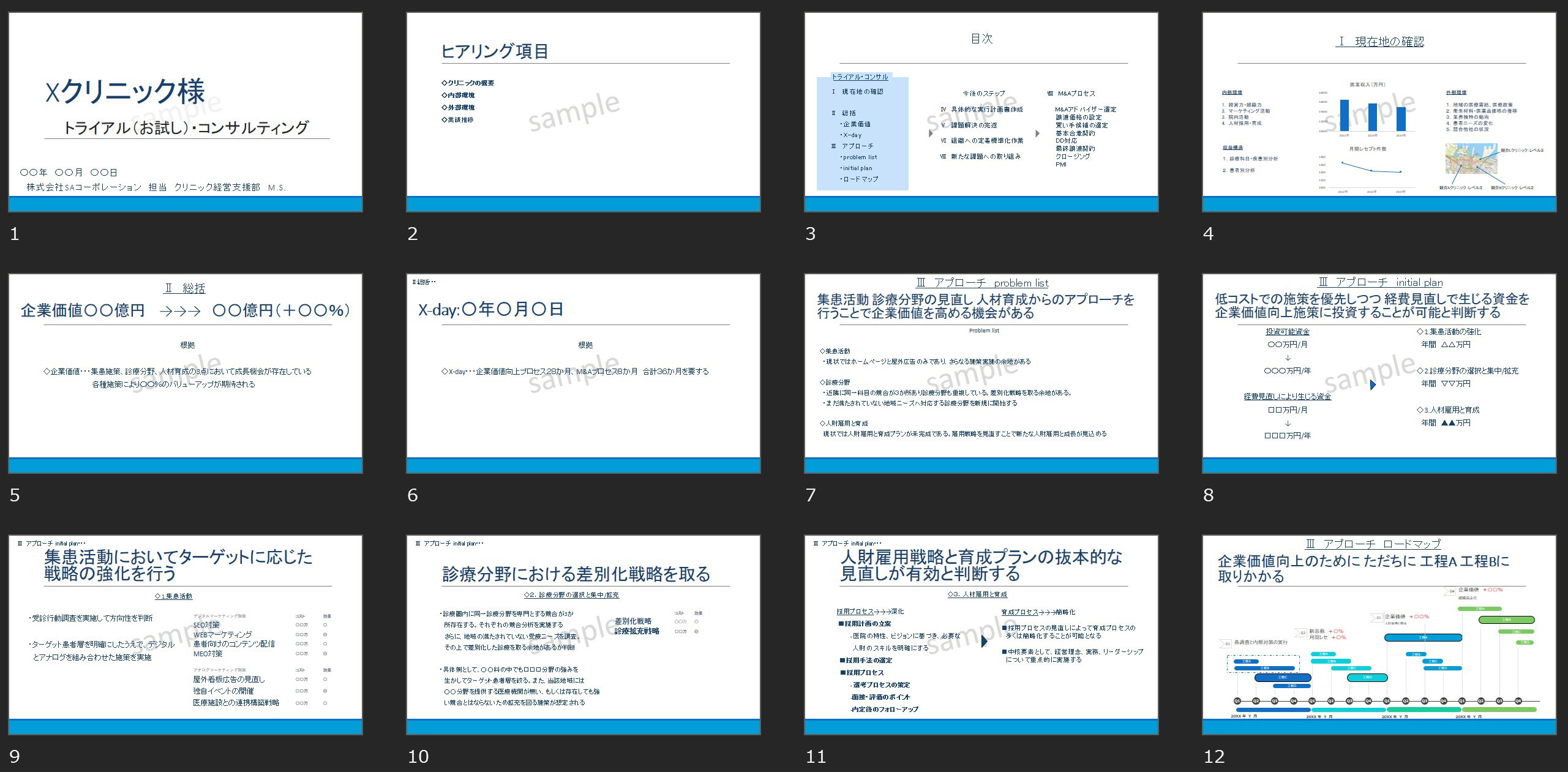 A. まず、クリニック経営の経験を持つコンサルタントが対応する点です。机上論理や数字データだけでなく、経営者の視点に寄り添った現実的なアプローチを取っていきます。